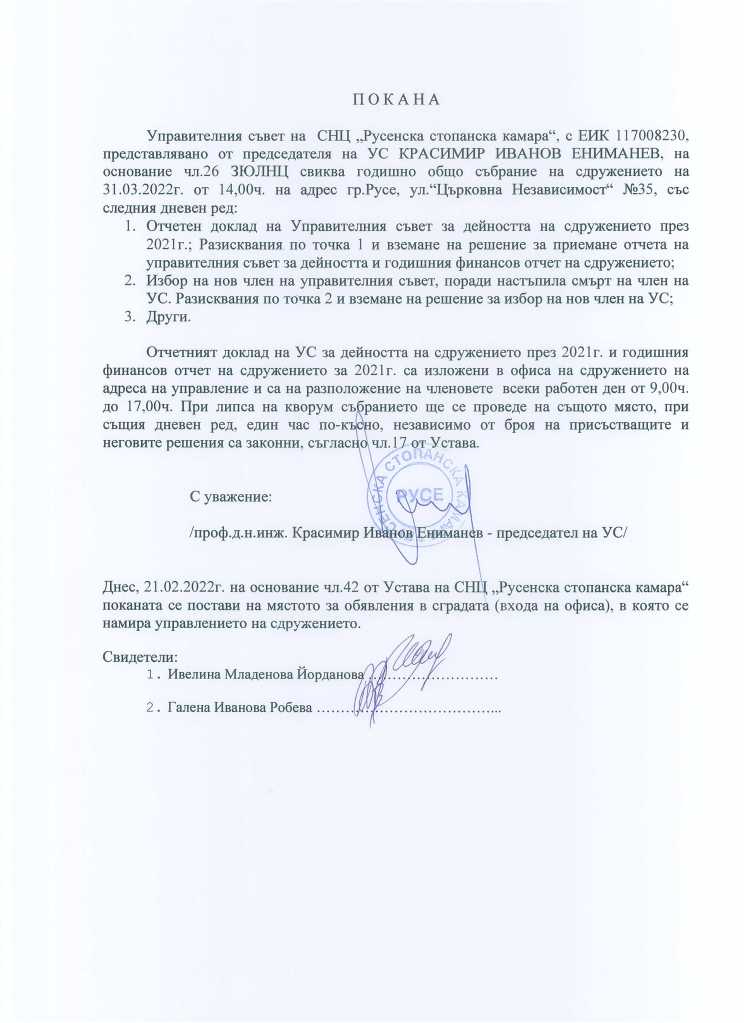 Покана за Годишно Общо Събрание By Русенска Стопанска Камара on 11.03.2022 Споделяне: Click to share on X(Отваря се в нов прозорец) X Споделяне във Facebook(Отваря се в нов прозорец) Facebook Харесвам Зареждане...‹ Проф. Ениманев: „Без дългосрочна програма не може да се направи бюджет за устойчиво развитие“проф. Ениманев: Скъпите суровини и материали могат да ударят силно строителния бизнес ›Категории:Заседания и срещи, Председател